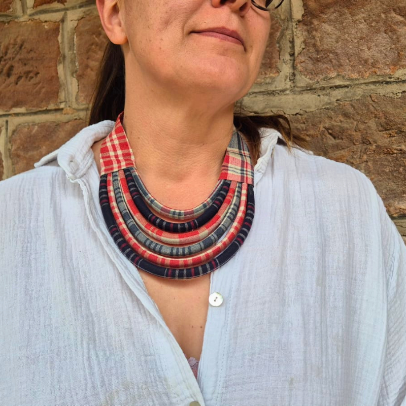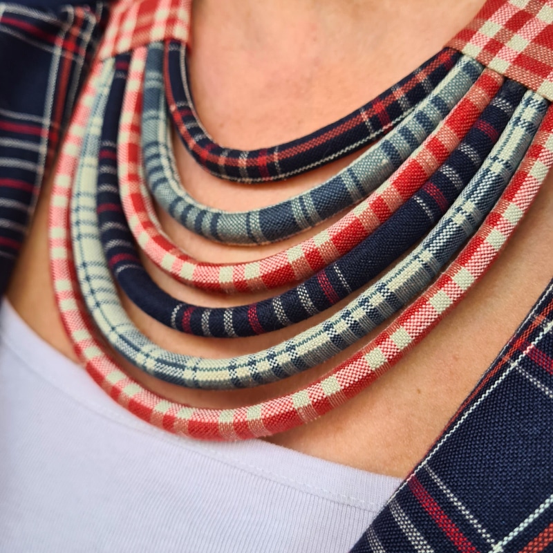 L’Elsass touche qui claque avec ce collier ras du cou en tissu kelsch. Un mariage audacieux entre tradition alsacienne et inspiration Wax africaine, YO, un vrai pichou !